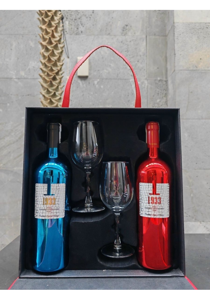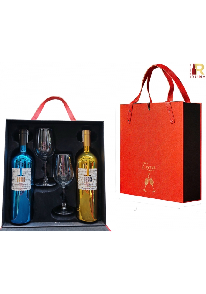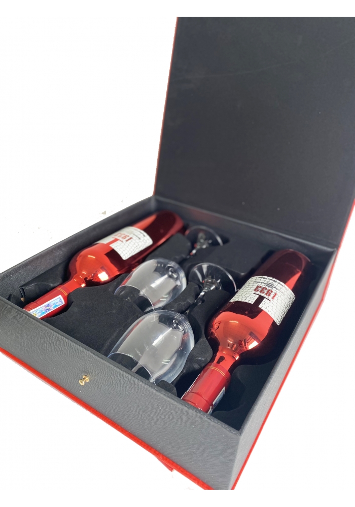 - 1 hộp da Pu cao cấp có khay định hình bên trong kèm 2 ly vang. Kích thước: 36 x 25 x 15 cm (có hộp màu đen, đỏ hoặc cam).