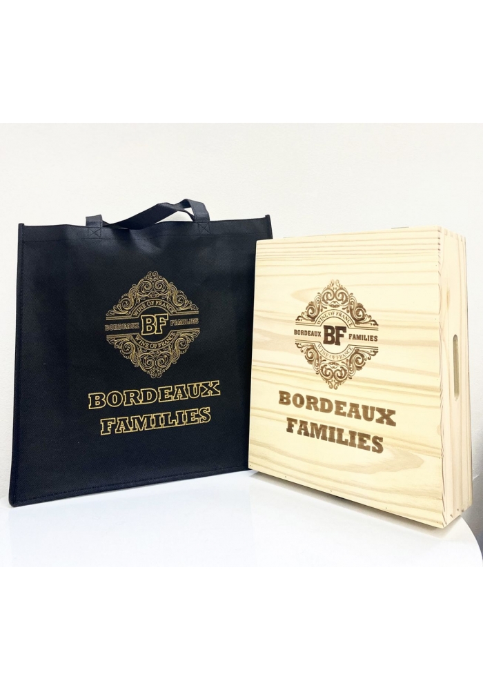 ● Hộp gỗ đựng 3 chai vang Pháp (khắc chữ Bordeaux Family): Kích thước: Dài 33 cm x Rộng 27 cm x Cao 10 cm.