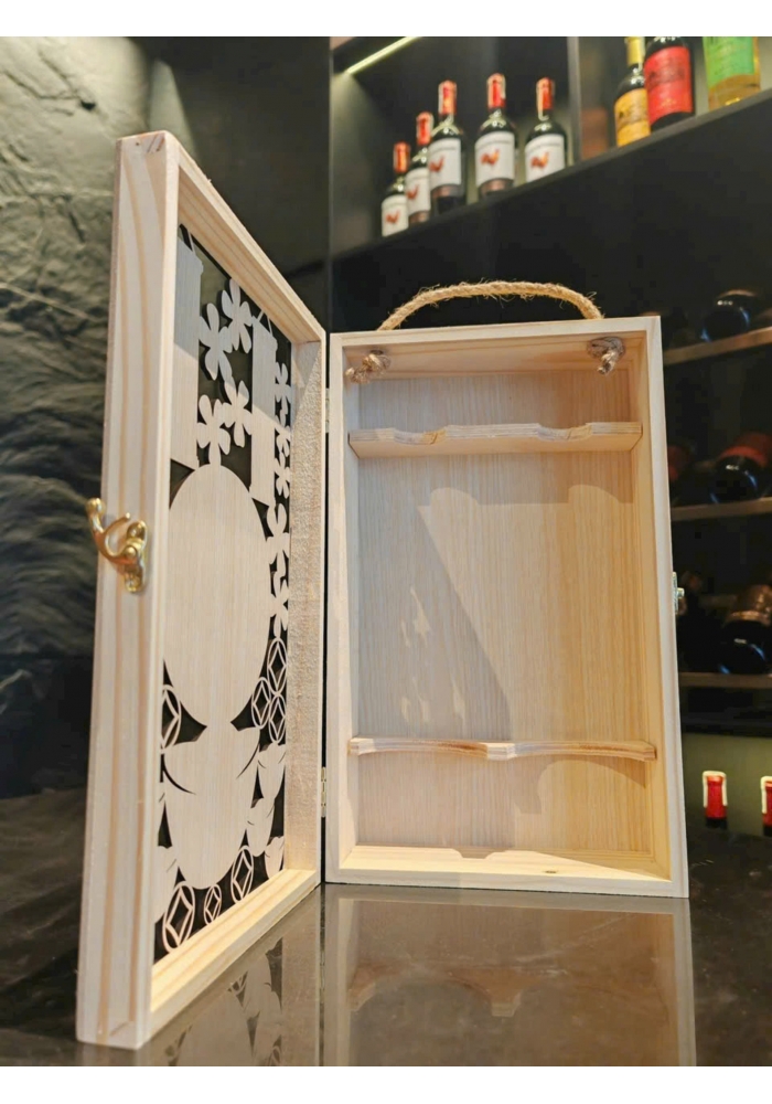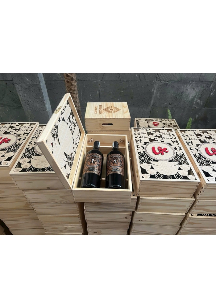 Có thể đựng được hầu hết các dòng rượu có dung tích 750ml. Có chạm khắc hoa văn, biểu tượng lộc phát kết hợp với 2 chai rượu vang tạo nên những set quà tặng sang trọng, độc đáo và ý nghĩa.