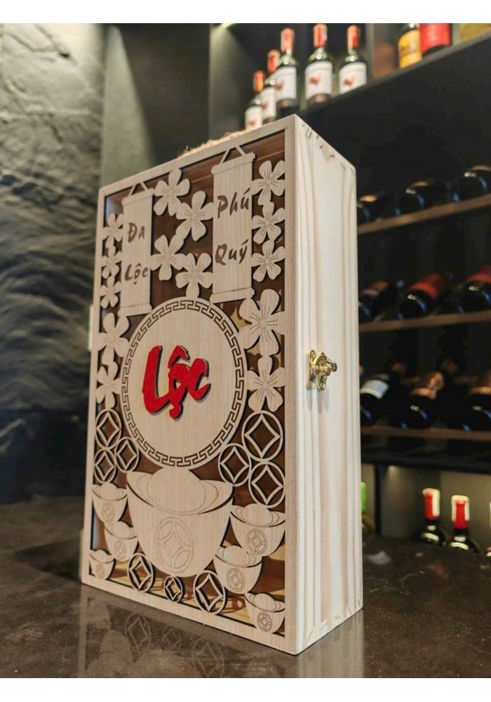 Hộp gỗ Lộc Phát đựng 2 chai rượu vang
