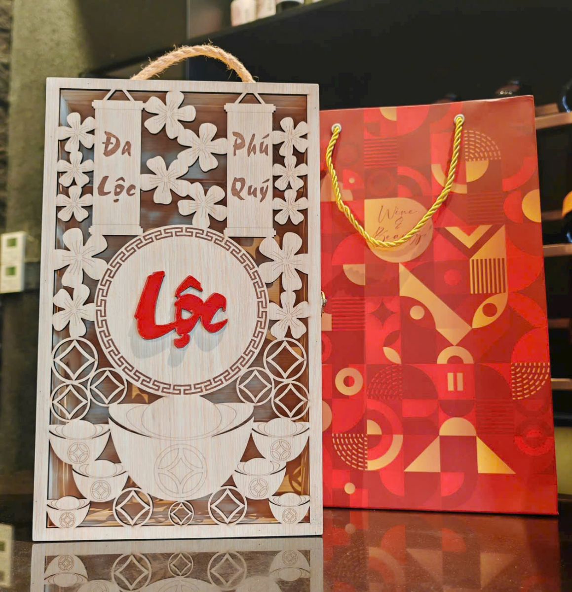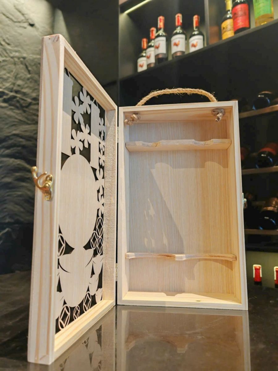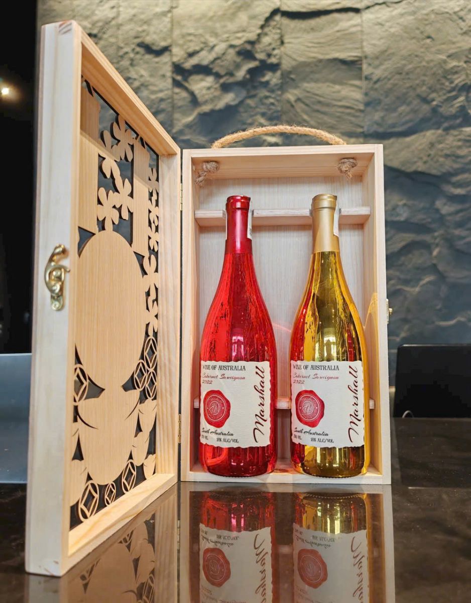 HÌNH ẢNH MINH HỌA HỘP GỖ LỘC PHÁT ĐỰNG 2 CHAI RƯỢU VANG