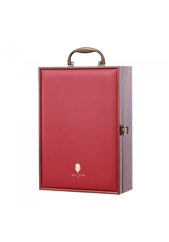 Hộp gỗ mặt da đỏ đựng 2 chai rượu vang