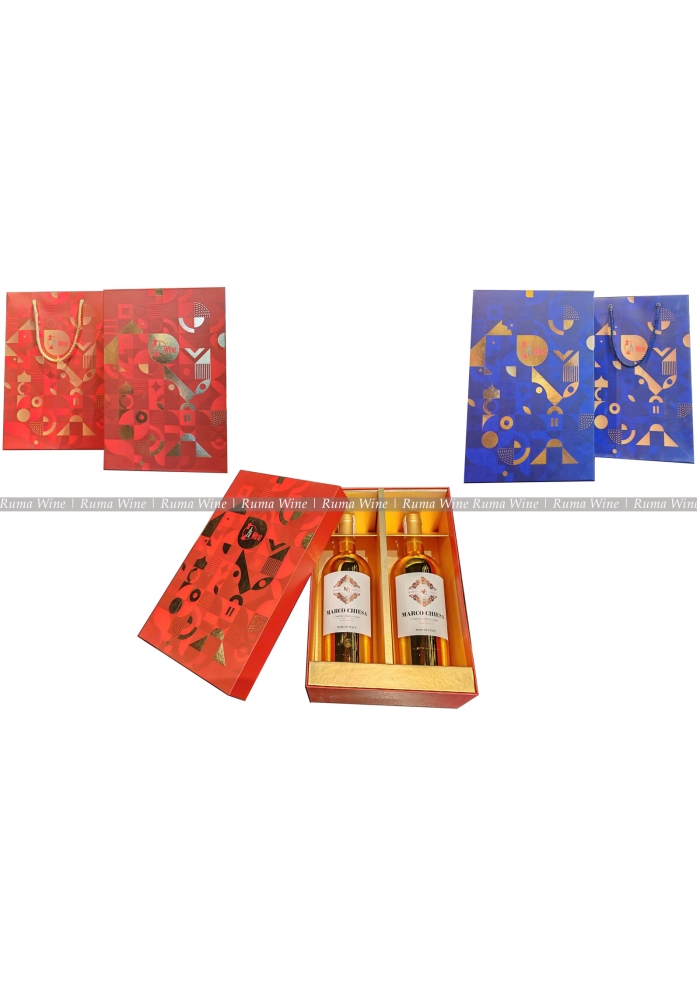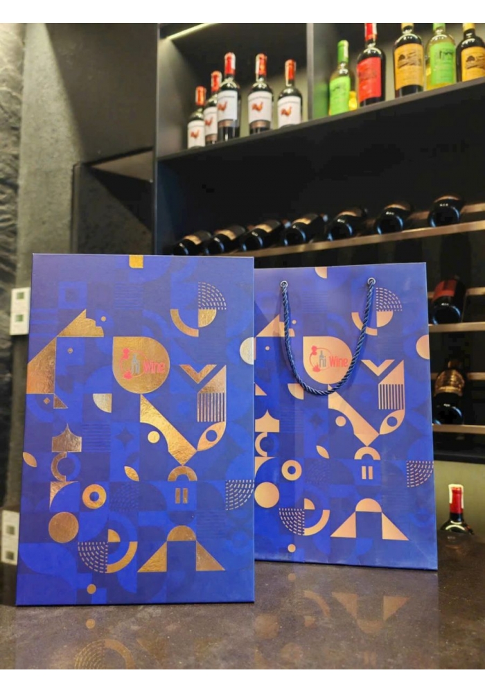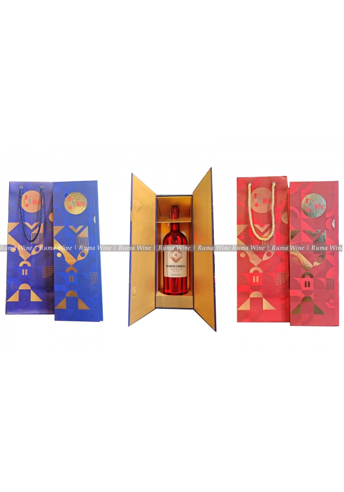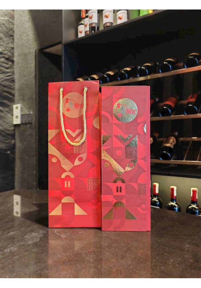 - Hộp rượu vang sắc màu với thiết kế hoa văn nổi bật, túi đựng ngoài chắc chắn, lịch sự.