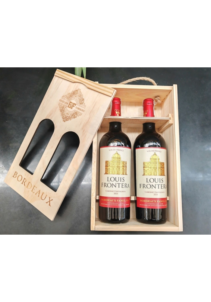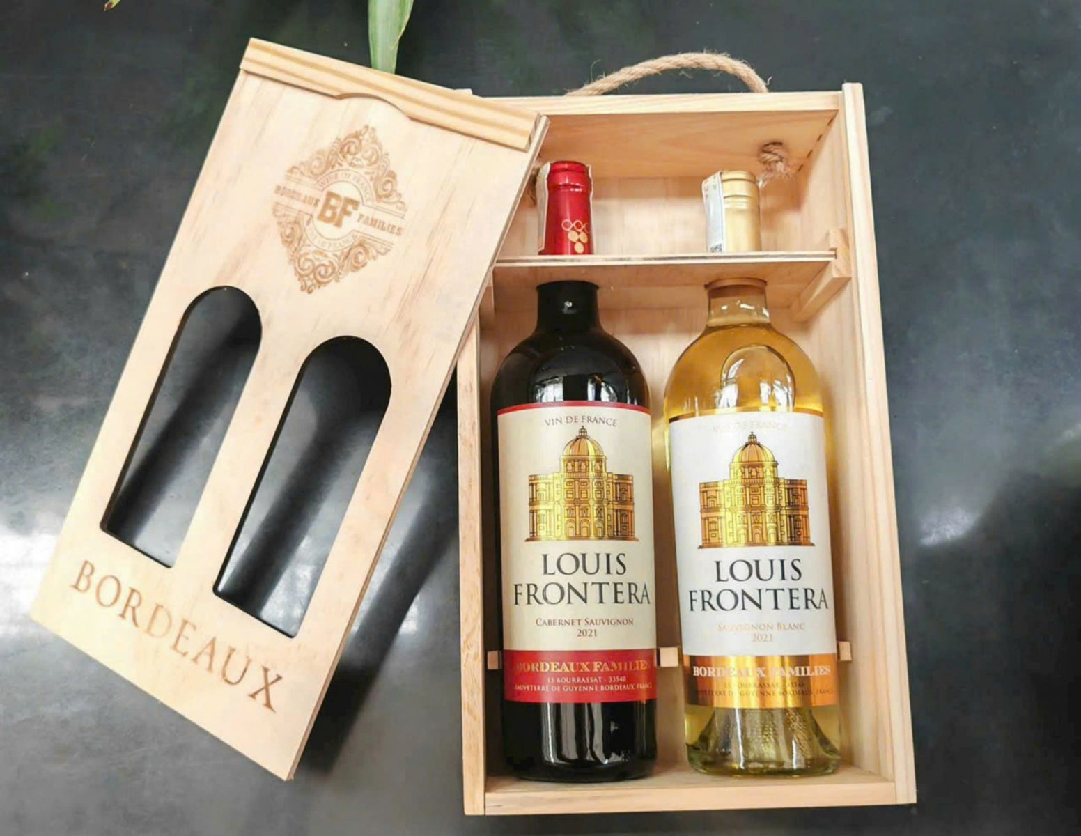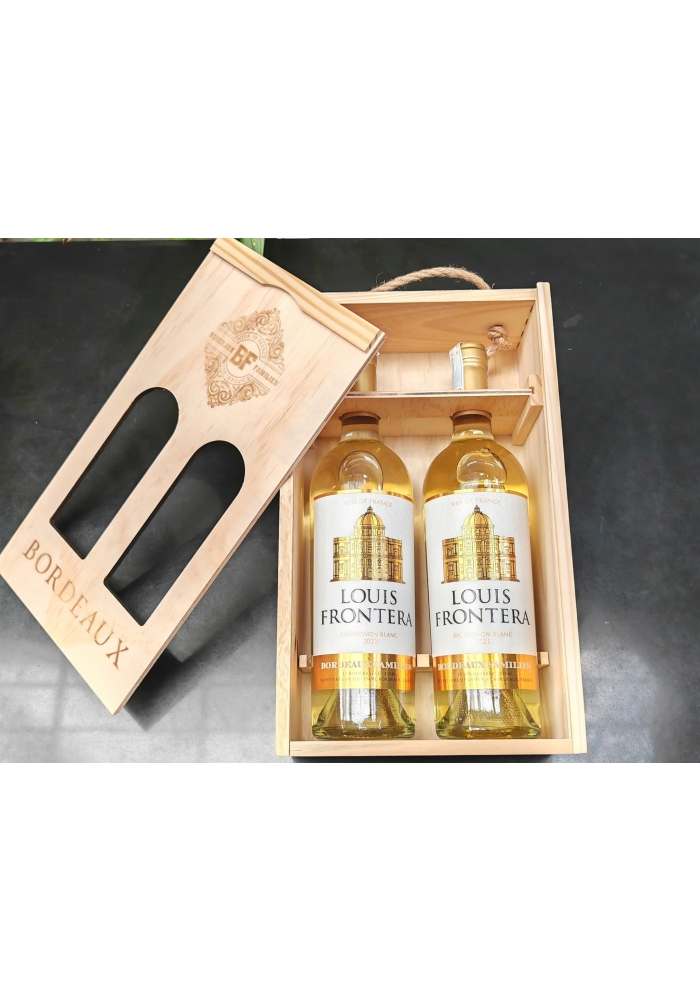 - Trên mỗi chiếc hộp gỗ 2 chai rượu vang Pháp Louis Frontera có thể điêu khắc logo, tên doanh nghiệp theo yêu cầu làm món quà tặng độc đáo gửi đến đối tác, khách hàng, bạn bè thân thiết.