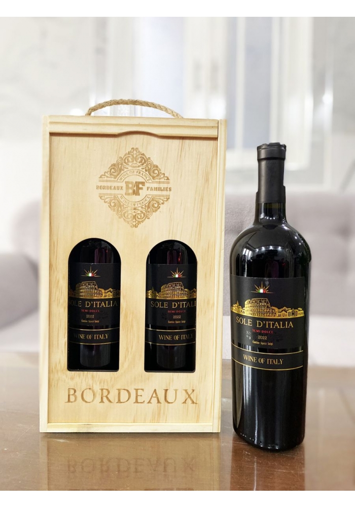 - Ngoài ra, trên mỗi chiếc hộp gỗ 2 chai rượu vang Ý Sole D'Italia có thể điêu khắc logo, tên doanh nghiệp theo yêu cầu làm món quà tặng độc đáo gửi đến đối tác, khách hàng, bạn bè thân thiết.