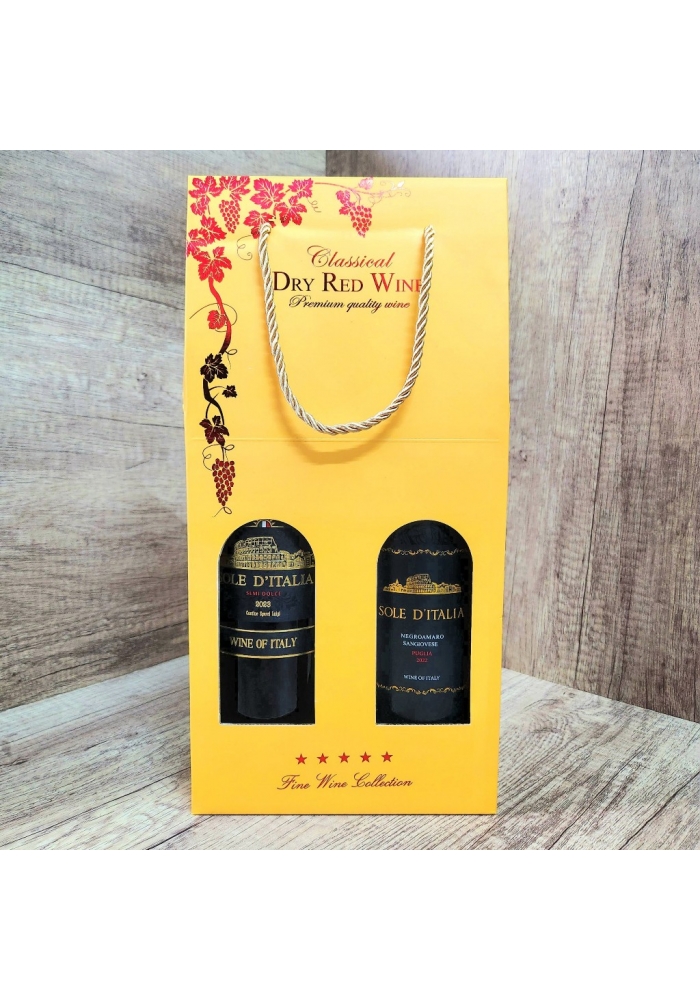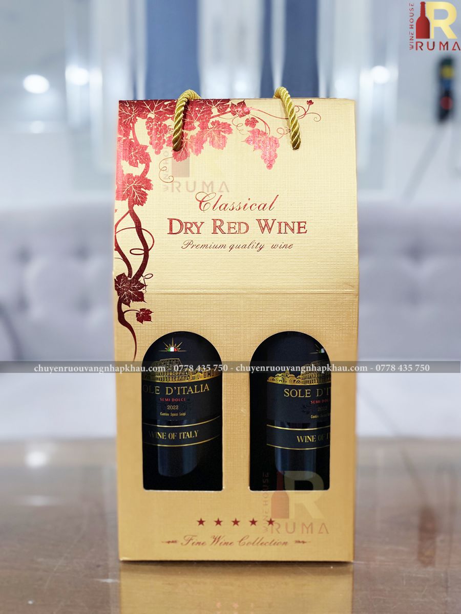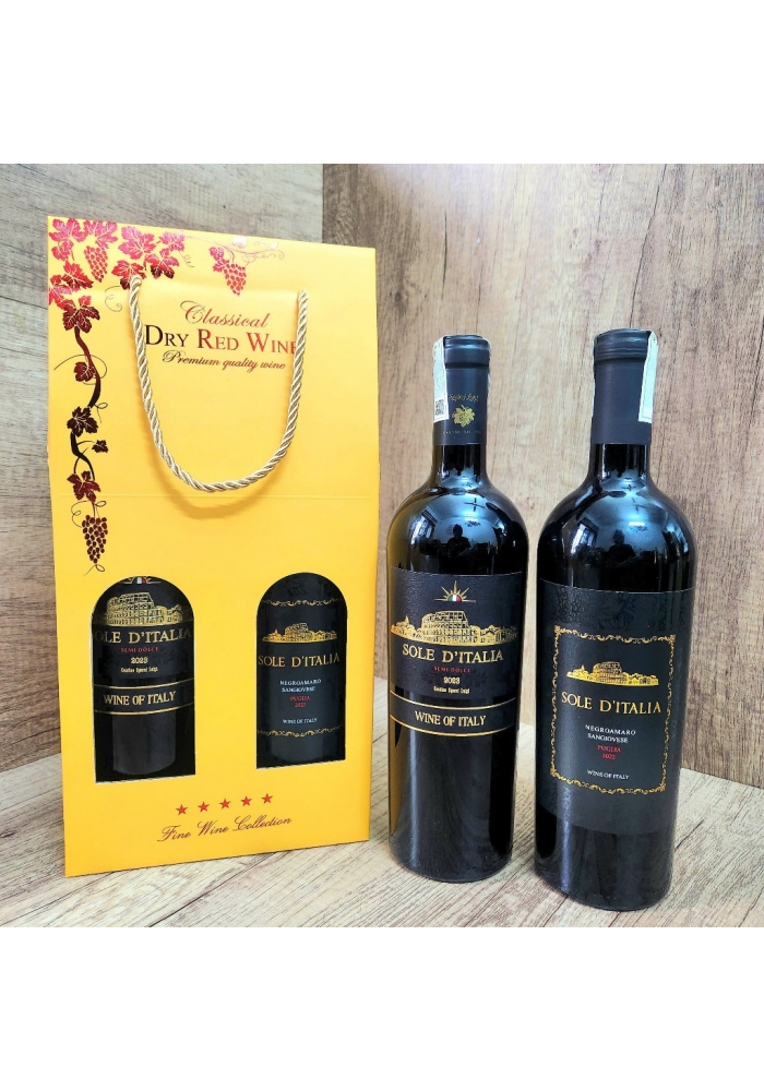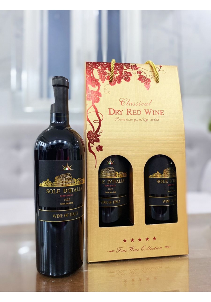 - Số chai rượu vang và màu vang trong một set hộp cũng mang nhiều ý nghĩa khác nhau. Trong đó, hộp 2 chai rượu vang Ý Sole D'Italia mang thông điệp: Gửi trao lời chúc may mắn, trân quý và gắn kết mối quan hệ trở nên bền vững hơn.