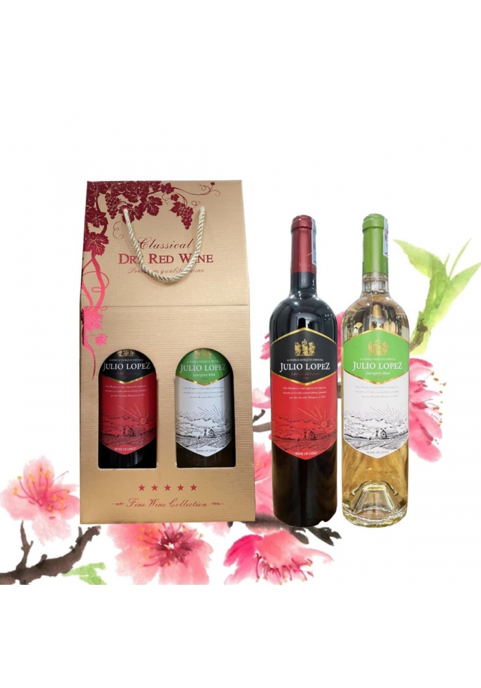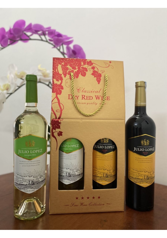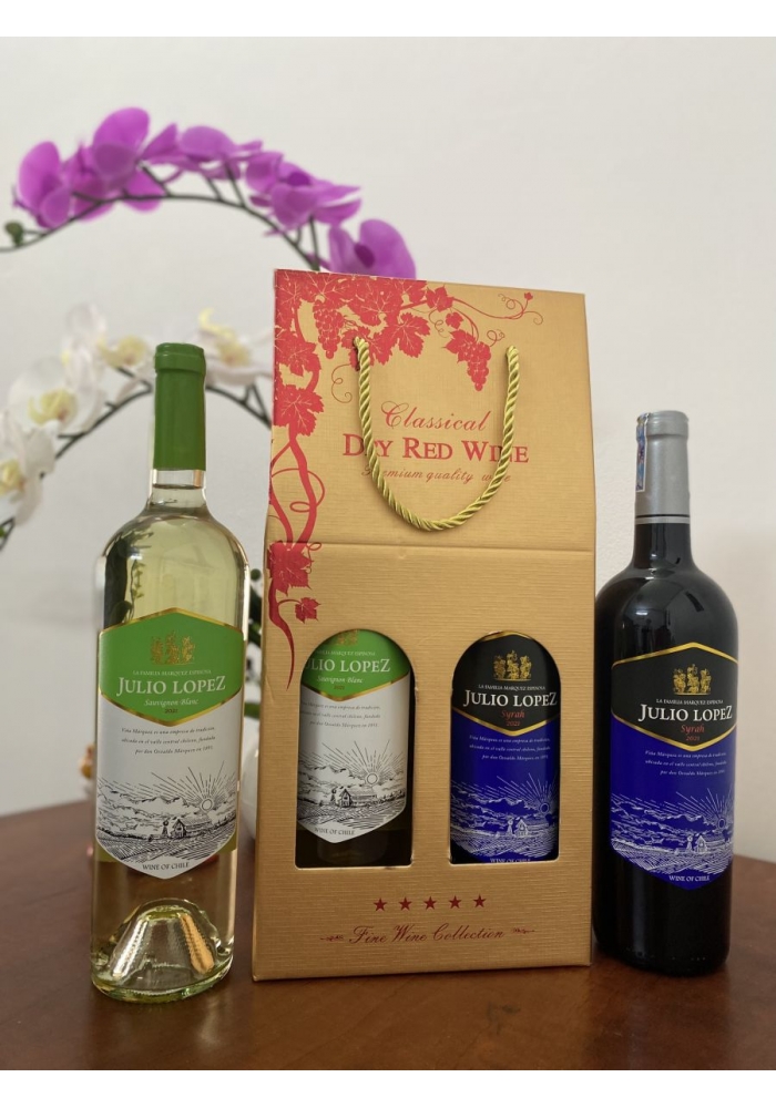 - 2 chai rượu vang Chile Julio Lopez (có 4 nhãn có thể tùy chọn hoặc mix với nhau).