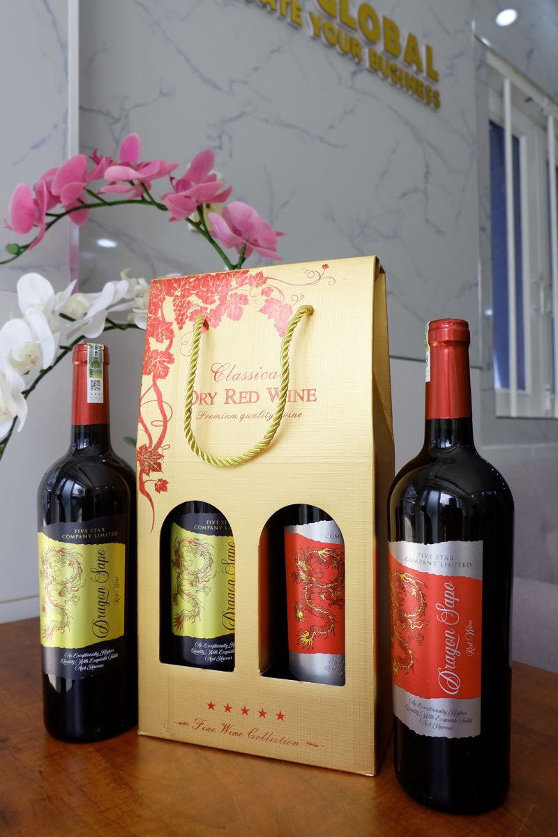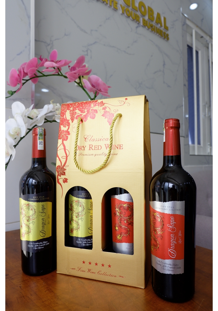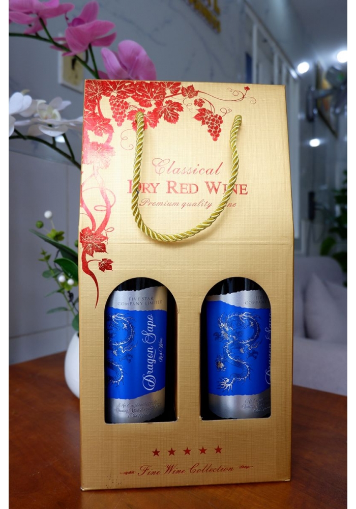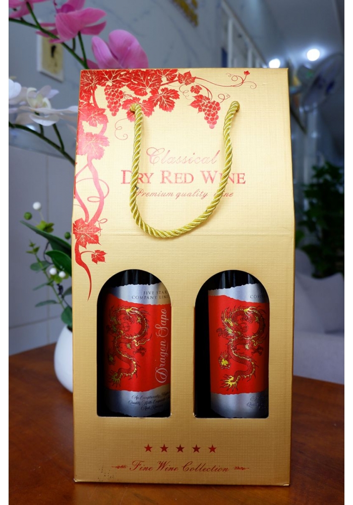 + 2 chai rượu vang Dragon (nhãn đỏ, xanh, vàng hoặc mix các màu với nhau)