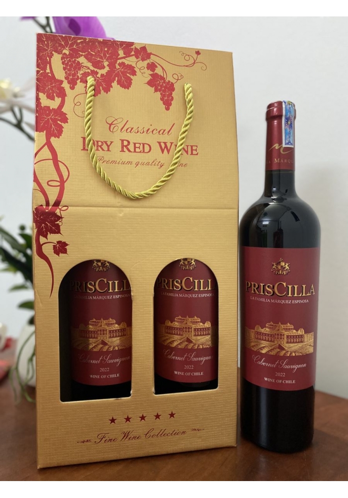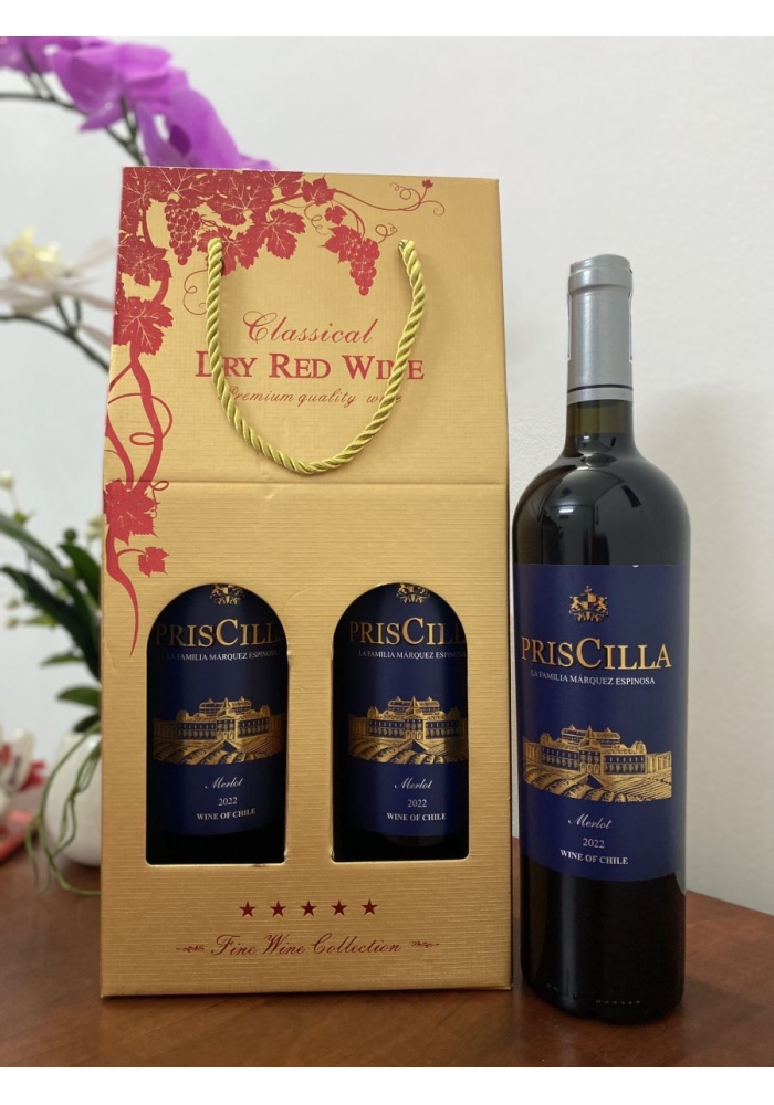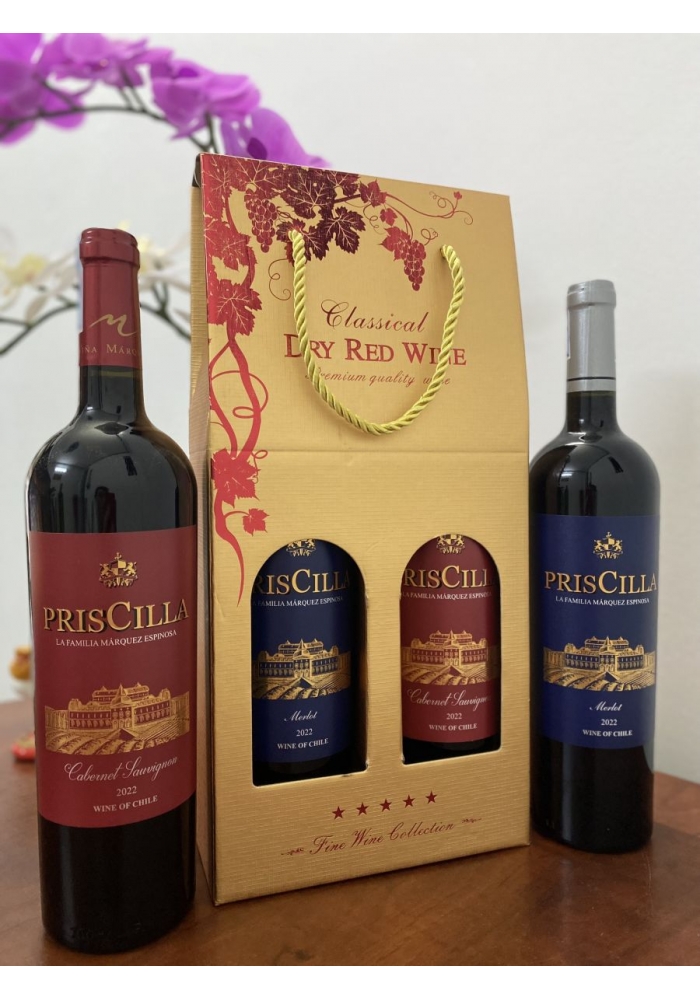 - 2 chai rượu vang Priscilla (2 chai vang nhãn đỏ hoặc nhãn xanh hoặc 2 chai vang trắng hoặc mix các nhãn với nhau).