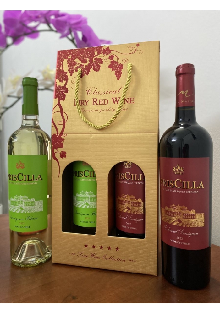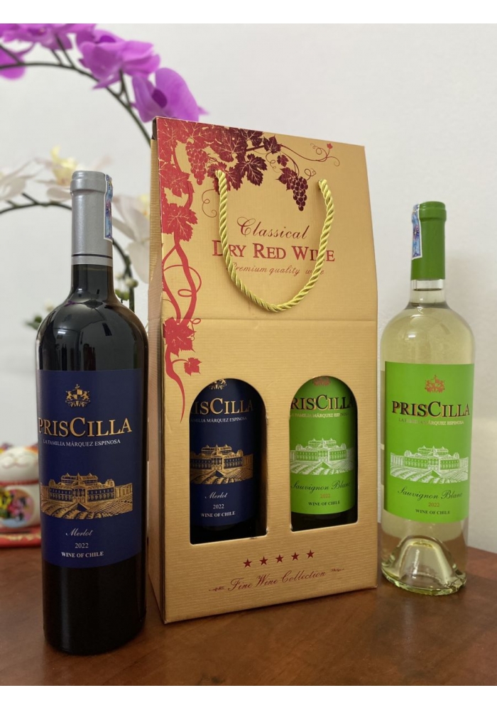 - Số chai rượu vang và màu vang trong một set hộp cũng mang nhiều ý nghĩa khác nhau. Trong đó, hộp 2 chai rượu vang Chile PrisCilla mang thông điệp: Gửi trao lời chúc may mắn, trân quý và gắn kết mối quan hệ trở nên bền vững hơn.