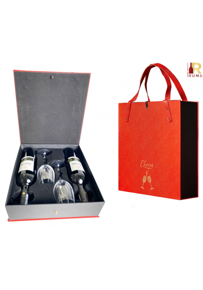 - 1 hộp da Pu cao cấp có khay định hình bên trong kèm 2 ly vang. Kích thước: 36 x 25 x 15 cm