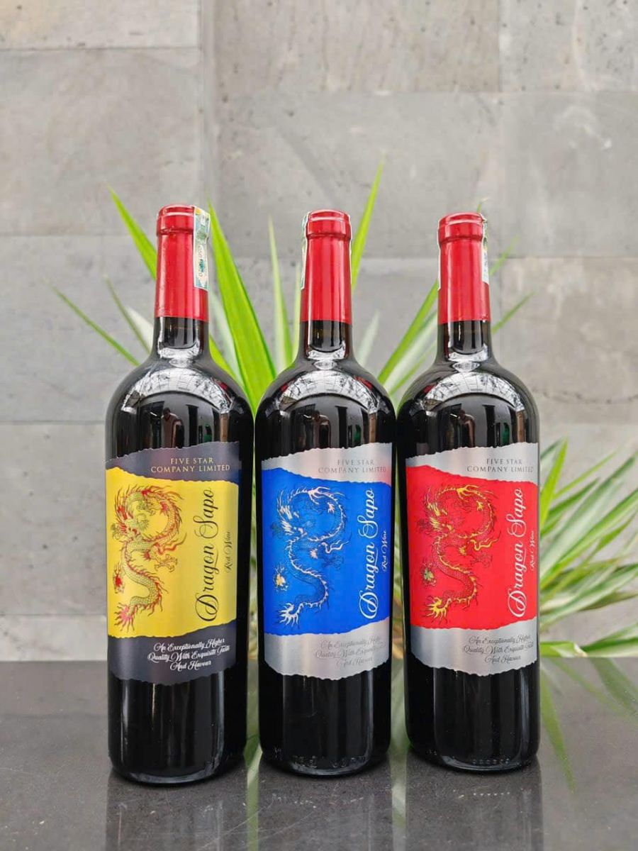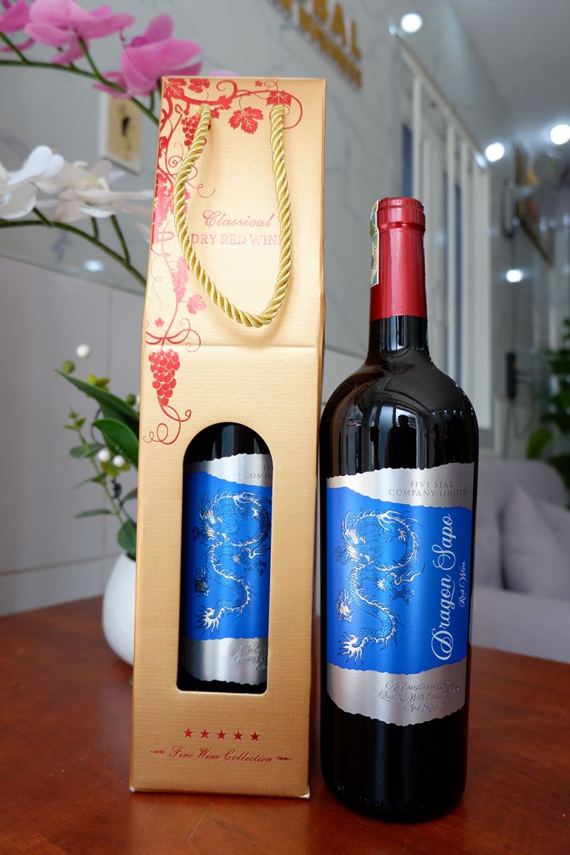 - 1 chai rượu vang Việt Nam Dragon, 13,5%. (3 nhãn xanh - đỏ - vàng để lựa chọn).