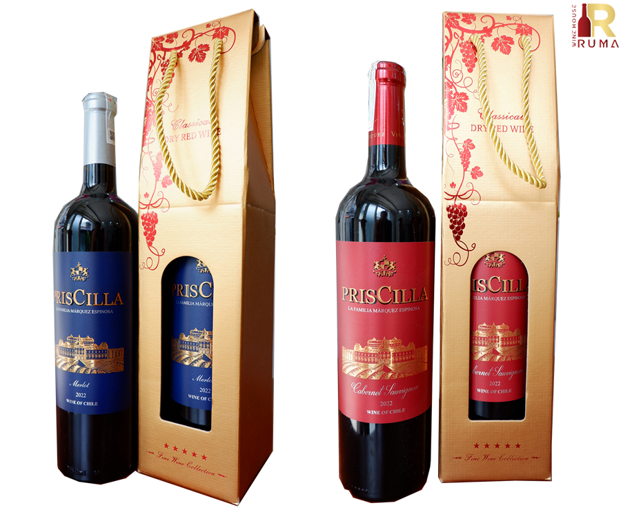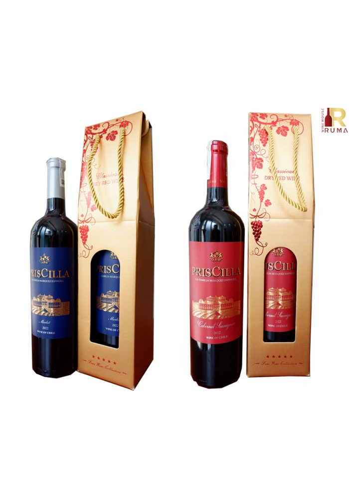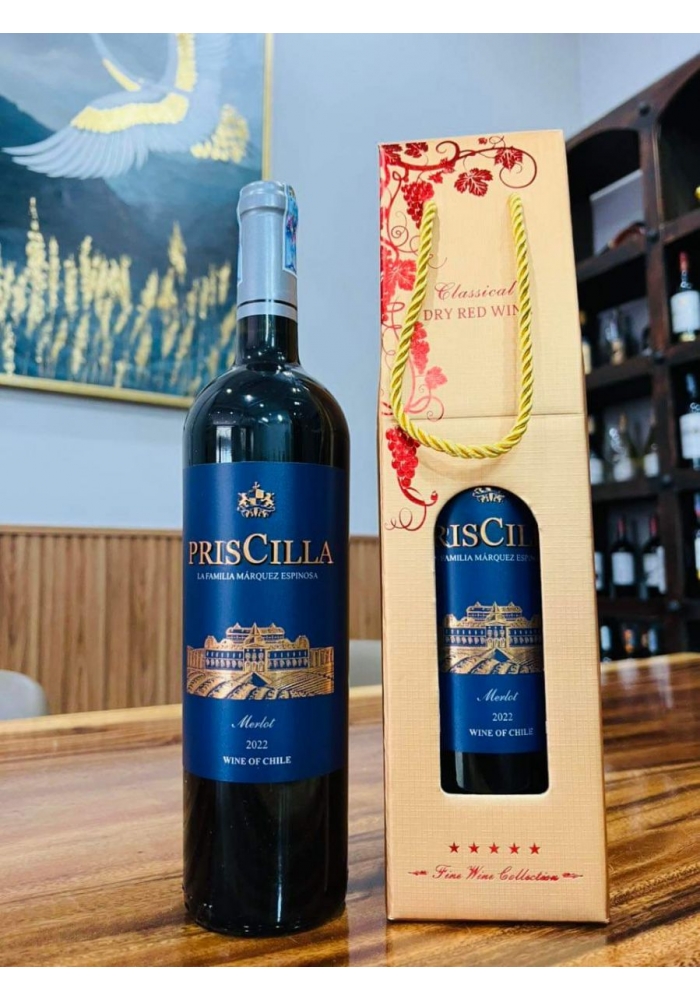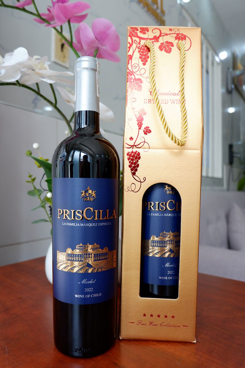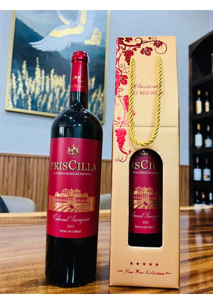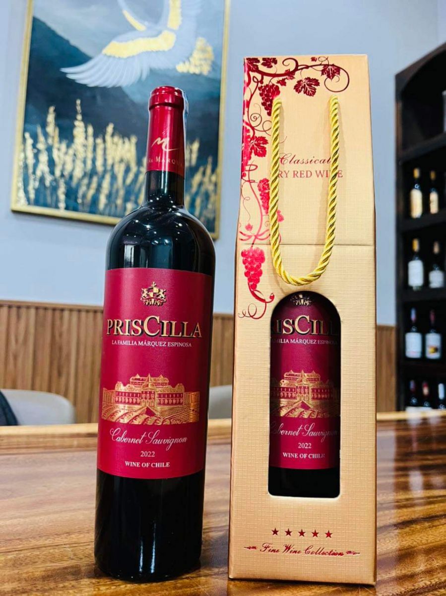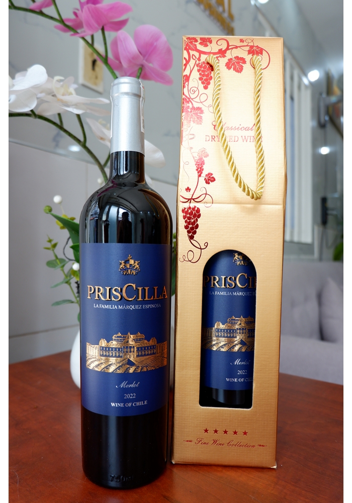 - 1 chai rượu vang Chile PrisCilla nhập khẩu, 13,5% (2 nhãn xanh - đỏ để lựa chọn).