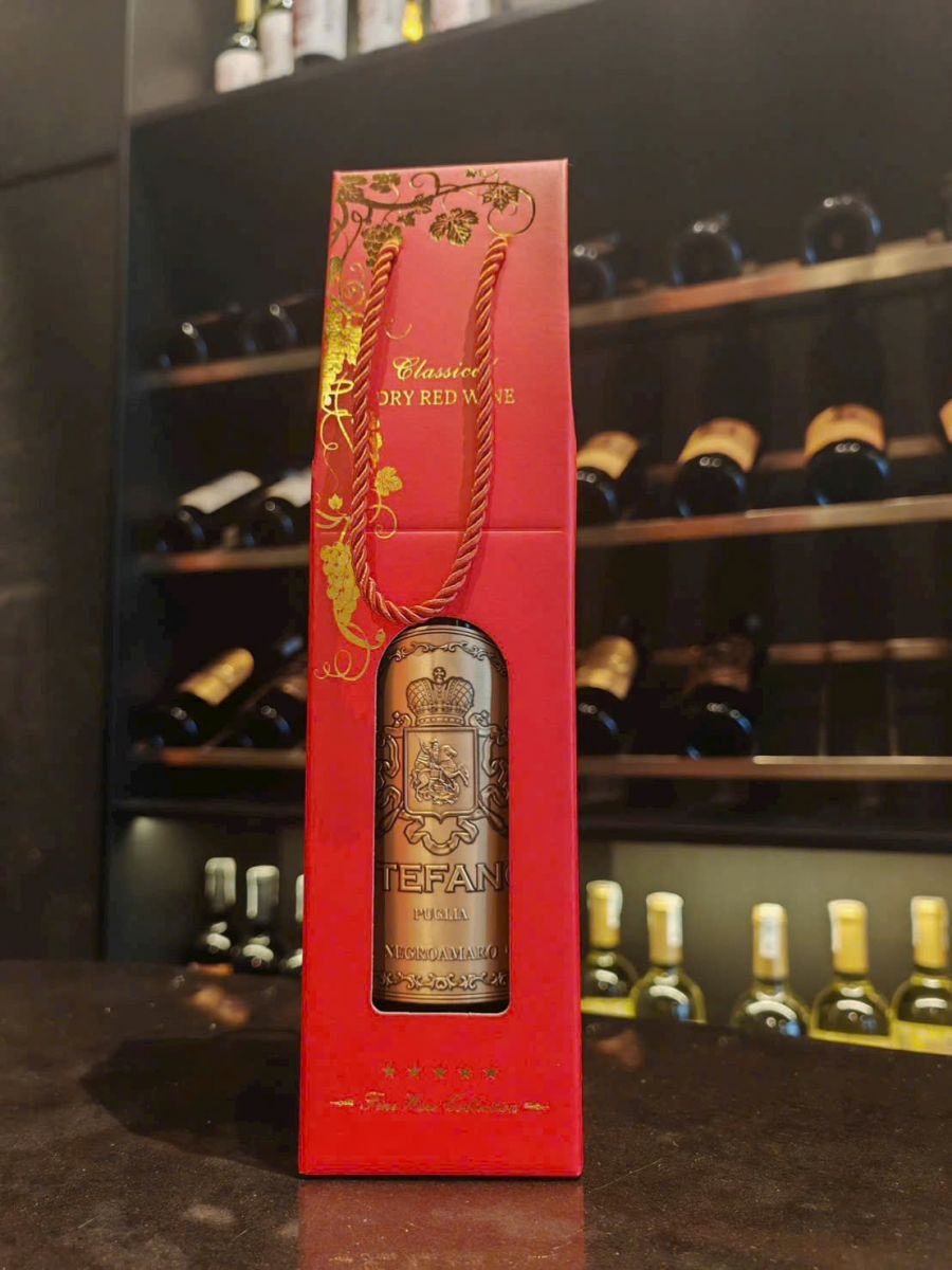 Hình thức set quà tặng túi giấy ép kim 1 chai vang Stefano: