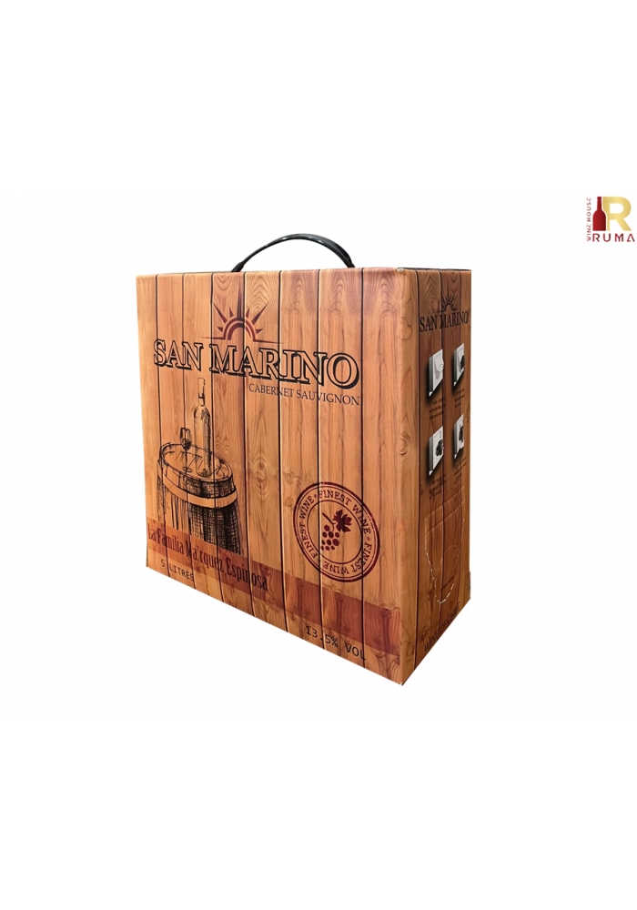 Mẫu mã thiết kế: San Marino là dòng rượu vang Chile có thiết kế đựng trong túi nhôm vừa bảo vệ vang khỏi các tác động của các yếu tố môi trường vừa là dạng bao bì tiết kiệm hơn nhiều, thân thiện với môi trường và thuận tiện trong việc vận chuyển, có vòi khoá tiện lợi.
