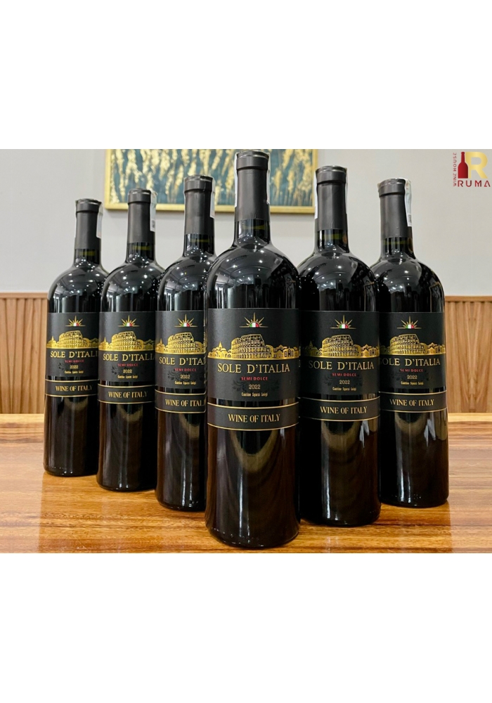 Mẫu mã thiết kế: Rượu vang Ý Sole D'Italia Semi thuộc dòng vang ngọt, được làm từ giống nho Blend, được sản xuất bởi nhà trồng nho nổi tiếng tại Ý. Vang ngọt Ý Sole D'Italia Semi được thiết kế với màu đen chủ đạo huyền bí, dáng chai cao, dài toát lên sự mạnh mẽ, nhãn chai nổi bật với hình ảnh nhà máy rượu Sole D'Italia.