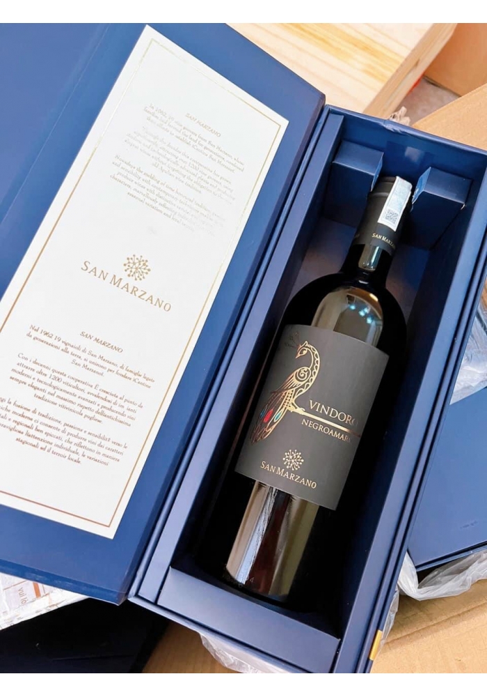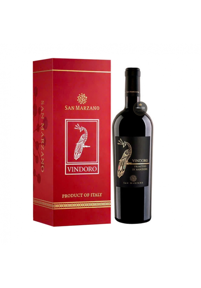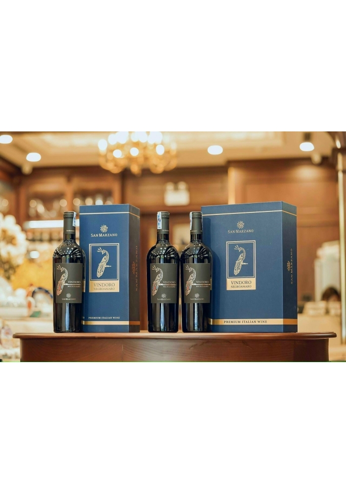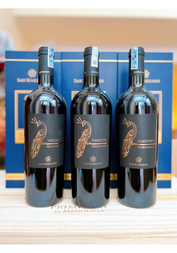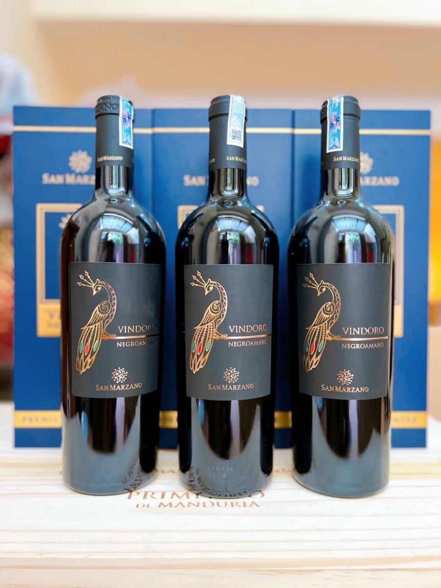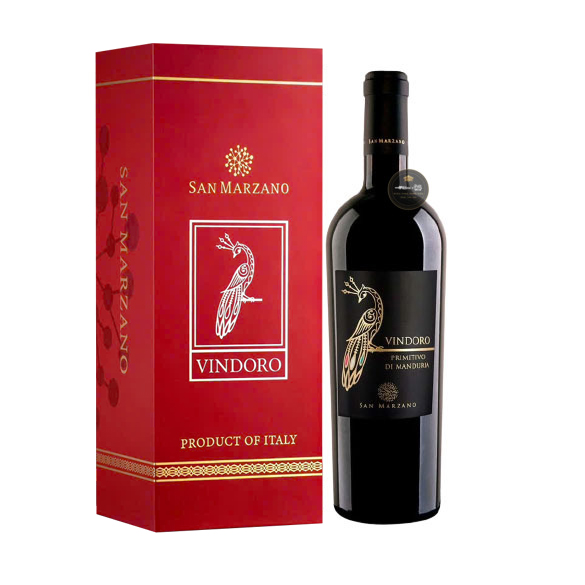 Mẫu mã thiết kế: Rượu vang Ý Vindoro Negroamaro hay còn gọi là rượu vang con công, nổi bật với thiết kế hình dáng con công màu vàng trên nền chai đen tuyền mang đến sự sang trọng, đẳng cấp và vô cùng may mắn. Đây cũng là một trong những dòng vang nổi bật của Cantine San Marzano, một thương hiệu vang Ý cho ra đời nhiều dòng vang nổi tiếng trên thế giới được giới sành vang lựa chọn.