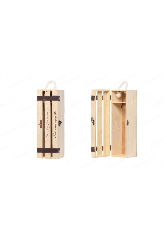 - Hộp gỗ với chất liệu gỗ thông, quai xách vải poli, gỗ thông đơn nan hở có in, có khoá bên hông tiện lợi. Thích hợp các dòng vang có dung tích 750ml, chiều cao nhỏ hơn 33cm. Kích thước hộp: 35 x 11 x 10.5 cm.