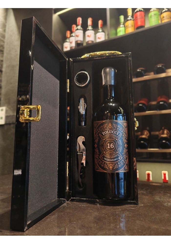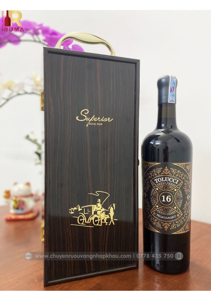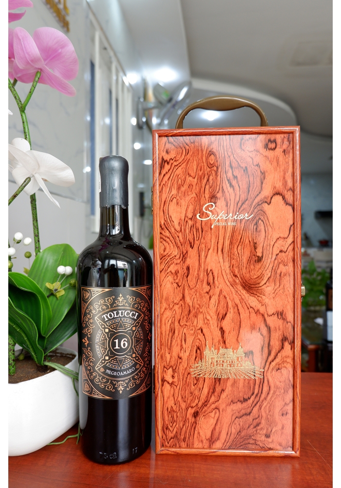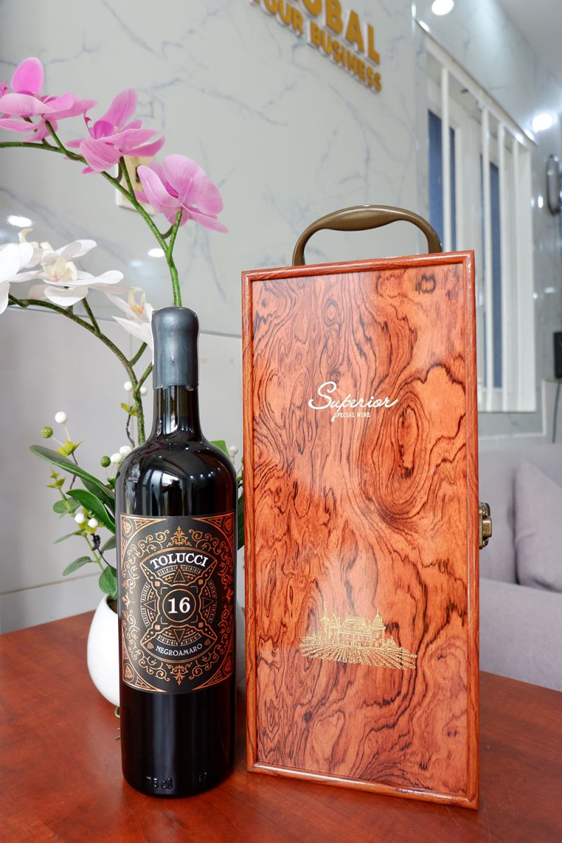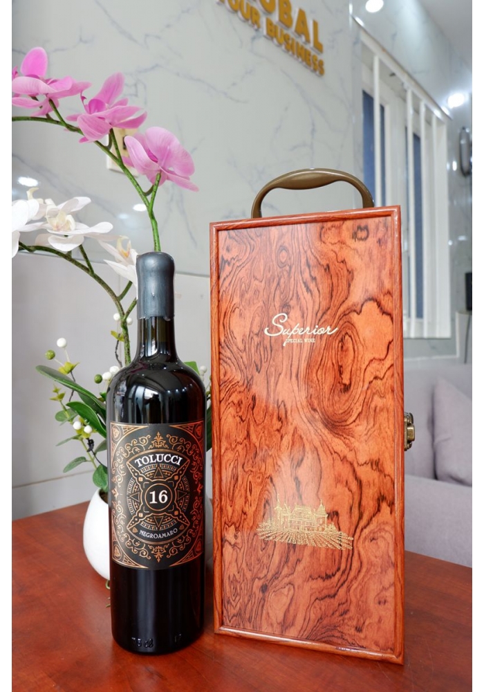Thông tin set quà tặng tết hộp sơn mài 1 chai rượu vang Ý Tolucci 16: