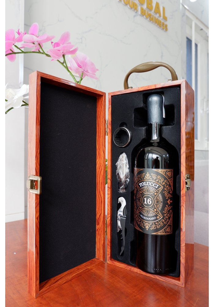 Hình thức set quà tặng tết hộp sơn mài 1 chai rượu vang Ý Tolucci 16: