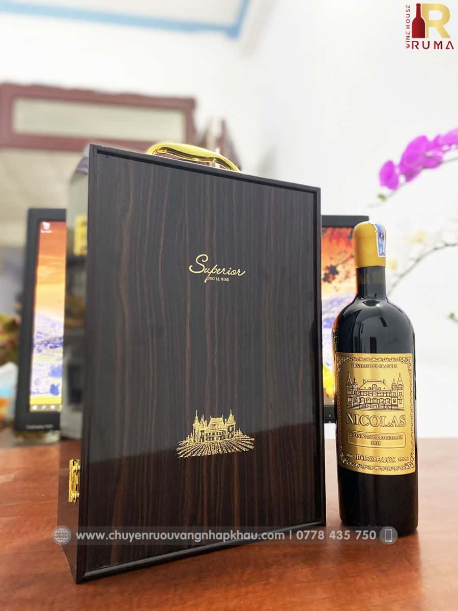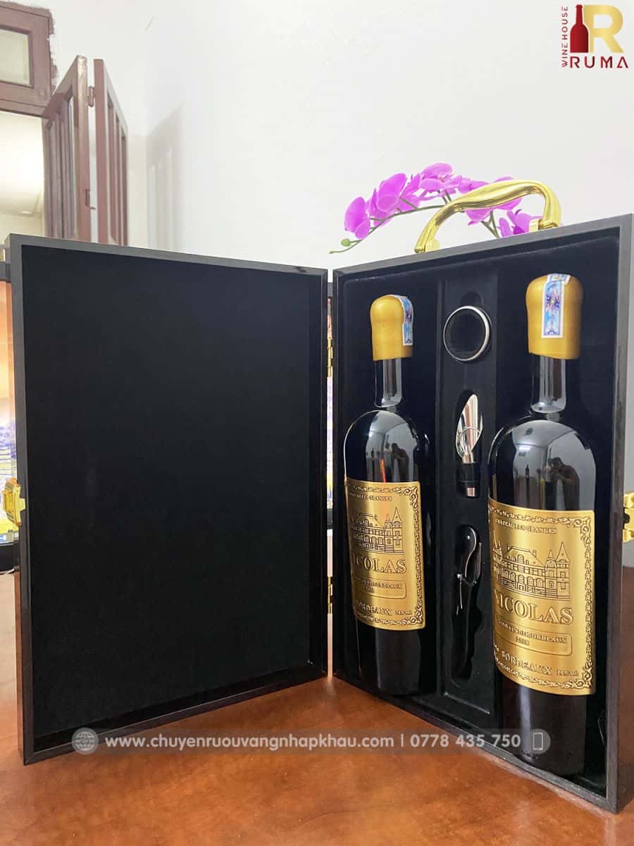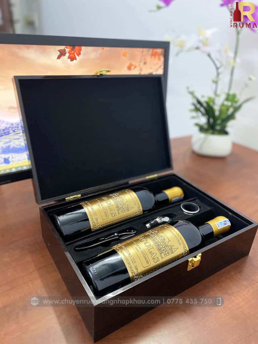 - Set 2 chai vang Nicolas là món quà tặng rượu vang doanh nghiệp được ưa chuộng, set quà được trau chuốt tỉ mỉ từ vỏ hộp cho đến cách thể hiện bên trong với lối thiết kế theo phong cách cổ điển nhưng không kém phần hiện đại.